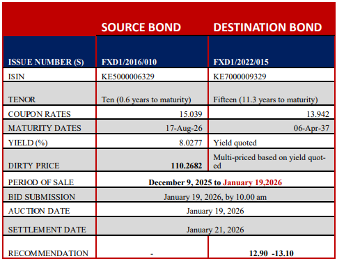 During the week, the Central Bank of Kenya continued to broadcast the prospectus for the voluntary switch from maturing bond FXD1/2016/010 to the reopened FXD1/2022/015.