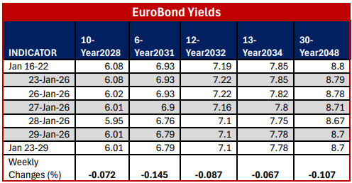 During the week ended 30th January 2026, the market showed a robust performance in the bond market, equities, derivatives, Eurobonds and the international market.