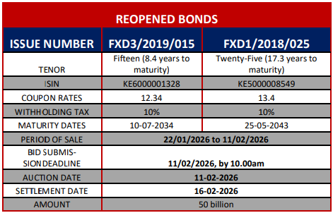 CBK continued to broadcasted the prospectus for the reopened 15-year and 25-year fixed-coupon Treasury bonds; FXD3/2019/015 and FXD1/2018/025 with the bid submission deadline being 11th February 2026.