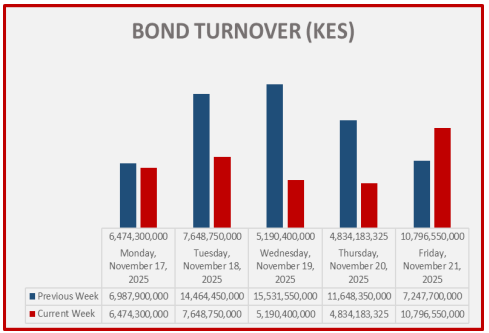 Bond turnover in the domestic secondary market decreased by 46.09% during the week ending November 21, 2025 . In the international market, yields on Kenya’s Eurobonds increased by 5.82 basis points on average.