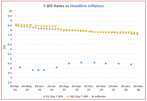 Yields decreased, with the 364-day paper's yield dropping by 7.5 bps to 8.9% , and the 91-day and 182-day papers yielding 7.6% and 7.8%, respectively, both down by 2.0 bps.