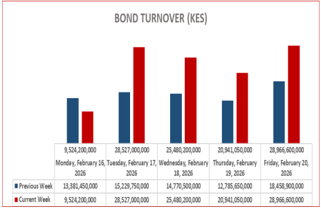 Week-on-week traded volumes have generally been consistent across the two week period with turnover spiking within the week, the turnover rose with a margin of 52% for the week ended 20th Feb 2026 compared to the previous week.
